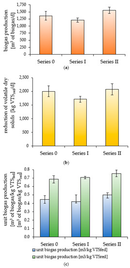 Biogas production (a), reduction of volatile total solids (b) and unit biogas production (c) in each series of the experiment.