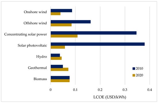 Furthermore, the competitiveness of solar PV in terms of levelized cost of electricity (LCOE) is also a driving force behind investment in plants installations. In 2020, the LCOE of solar PV fell the most among RES; see Figure 3 [9,10]. Specifically, the global weighted-average LCOE of solar PV in 2020 had decreased by 85% compared to 2010 and by 7% compared to 2019. The country-level weighted-average LCOE of utility-scale solar PV declined between 72% and 87% between 2010 and 2020, depending on the country. In Vietnam, the world’s third-largest market for solar PV, this weighted-average LCOE declined by 58% between 2016 and 2020.