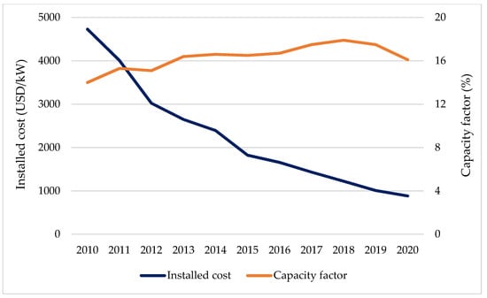 Global weighted-average installed costs and capacity factors of Solar PV in 2010–2020. (Adapted from Refs. [9,10]).