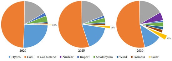 In 2011, specific targets for installed capacity and power output of solar PV were first outlined in the Seventh Power Development Plan (PDP7) [54] and then amended in 2016 under the revised PDP7 [57]; see Figure 6. Accordingly, the total capacity of solar PV is expected to reach 850 MWp, 4000 MWp, and 12,000 MWp in 2020, 2025, and 2030, respectively accounting for 0.5%, 1.6%, and 3.3% of the total electricity output.