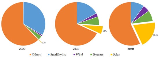In 2015, the first government-level document on a development strategy specifically for renewable energy (REDS) was issued [56]; see Figure 7. In REDS, the specific targets for electricity production from solar PV were planned to be up to 1.4 billion kWh, 35.4 billion kWh, and 210 billion kWh, accounting for 0.5%, 6%, and 20% in 2020, 2030, and 2050, respectively. In addition, other measures proposed in REDS to implement the objectives of the strategy include: credits for RES; exemptions on import duties on certain equipment, materials, and products that cannot be produced locally; exemptions and reductions of corporate income tax and/or land use costs.