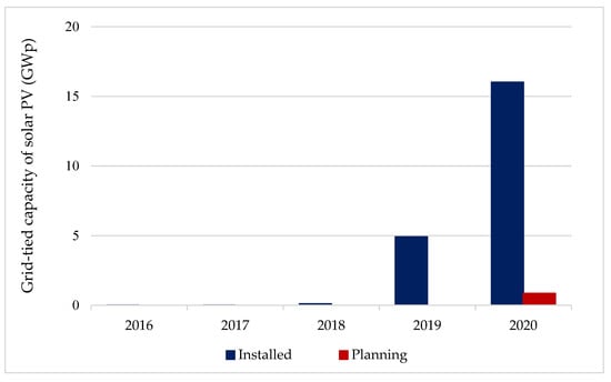 The issuance of FIT mechanisms and accompanying incentives has facilitated the rapid growth of solar PV in Vietnam in 2019–2020, with a total installed capacity of around 16 GWp, far exceeding the target for solar PV in 2020 under the revised PDP7; see Figure 8 [2,3,4].