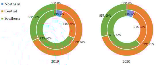 Moreover, the deployment of solar PV applications was uneven across the country; see Figure 10 [43,44,64,65]. Most of the deployment of these solar PV applications was concentrated in the south and central regions. Specifically, in 2019, the total installed capacity of new RTS and SPP was 26% and 68% in the central region, and 68% and 32% in the south region, respectively. The new installed capacity in the north region was the lowest with 6% RTS and no SPP. In 2020, although there was a change in the percentage of installed capacity of RTS and SPP in each region, the total installed capacity of solar PV applications in the north was still the lowest. The total installed capacity of new RTS and SPP accounted for about 32% and 70%, respectively, in the central region, and 62% and 29% in the south region. In 2020, the installed capacity of new SPP is mainly located in the south-central region due to the special incentives of the FIT mechanism for Ninh Thuan province [38].