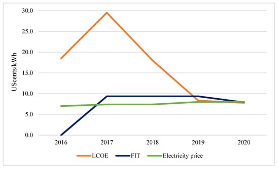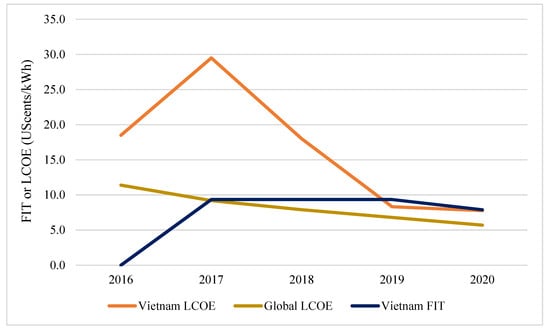 The FIT prices for solar PV in Vietnam today are fixed and only for grid-connected applications [36,37,38]. The FIT mechanism here is determined based on the global weighted-average LCOE of a solar PV at the time of issuance and is guaranteed for 20 years thereafter.