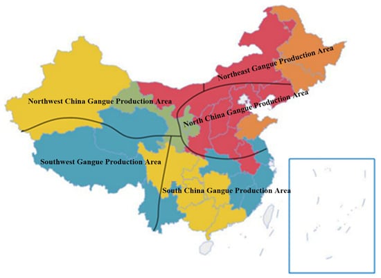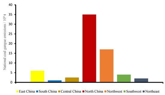 Coal is the most commonly used energy source at present; consequently, coal mining brings a large amount of coal gangue emissions. The most commonly used treatment method for coal gangue is natural accumulation, to form a coal gangue mountain. China is a big country in coal production and consumption; according to incomplete statistics, there are nearly 2000 large coal gangue hills, with about 6 billion tons of accumulated coal gangue, covering an area of about 20,000 hectares, and increasing by 150–200 million tons per year [1,2,3,4]. The overall distribution of coal gangue is characterized by “more in the north than in the south, and less in the west than in the east”. The national coal gangue emission distributions are shown in Figure 1. Combined with the occurrence status and regional distribution characteristics of coal resources in China, considering the coal gangue horizon and the coal accumulation basin, coal gangue production areas in China can be roughly divided into five regions: namely, Northeast China, North China, South China, the Southwest, and the Northwest. According to the output of the producing area, they are divided into five grades of red, orange, yellow, green, and blue, as shown in Figure 2 below [5,6].
