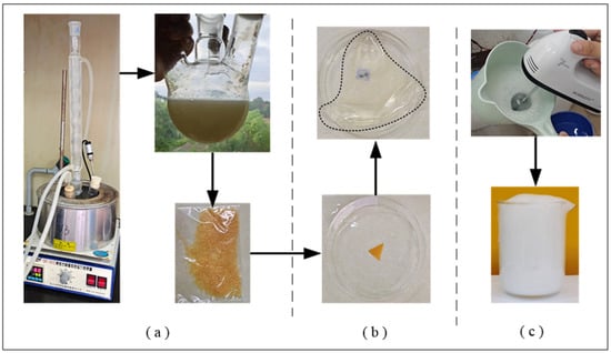 In this experiment, superabsorbent foam stabilizer was synthesized by a hydrothermal method. A certain mass of chitosan was dissolved in 2% glacial acetic acid solution and stirred evenly in a magnetic stirrer, until it became a viscous liquid. Then, a certain amount of potassium persulfate solution was added, and the neutralization degree of acrylic acid reached 80% by neutralizing acrylic acid solution, with 20% sodium hydroxide solution in an ice bath. After the temperature of acrylic acid solution was restored to room temperature, the above solution was transferred into chitosan solution and stirred evenly. Then, a certain mass of cross-linking agent (N, N′-methylene bisacrylamide) was added, and the gel was prepared by heating the magnetic stirrer in a water bath with a heating constant temperature. The reaction temperature was controlled, and the gel was protected by nitrogen. The main test process is shown in Figure 3a.