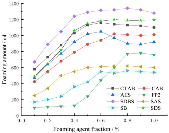 Based on the principle of the comprehensive performance of the foaming agents, eight surfactants were selected for foaming capacity experiments. Firstly, the foaming capacity of a single foaming agent was measured by the Waring blender method, and three materials with the best starting foaming ability were selected for eight materials by the Waring blender stirring method. The standard waring-blender method uses distilled water. Since this product will be used in coal mine production, tap water was used in this experiment. The foaming volume of each foaming agent is shown in Figure 4.