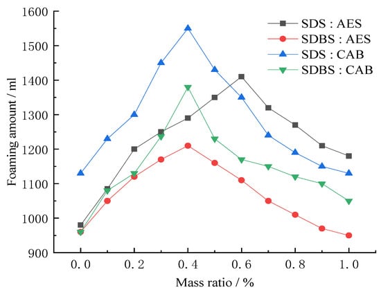 We combined SDBS, CAB, AES, CAB, four kinds of foaming agents, into pairs; the concentration was determined to be 0.6%. Then, we changed the ratio of the four kinds of foaming agents when paired, and used the Waring blender method to carry out the foaming experiment, and obtained the foam. The volume change is shown in Figure 5.