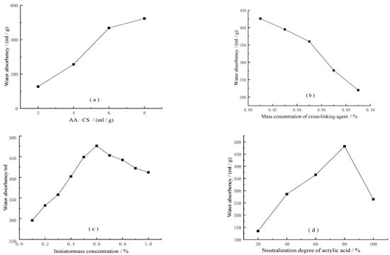 - Effect of chitosan and acrylic monomer ratios on water absorption properties.As can be seen from Figure 6a, when the monomer dosage was low, there were not enough monomers to graft and cross-link with chitosan. The induction period of the polymerization reaction was prolonged, the reaction rate was slow, and the cross-link density was low. The soluble part of the gel increased, so the absorption rate was low. As the monomer dosage increased, more available monomer molecules near the chitosan large radical chain growth site may have been grafted onto the chitosan backbone, which improved the grafting efficiency and the hydrophilicity of the corresponding highly absorbent agent which, in turn, improved the water absorption rate. When the monomer dosage reached a certain level, the monomer concentration was too high, and the increase in this ratio led to the self-polymerization of acrylic acid, and the grafting or linking of chitosan with acrylic acid. When the monomer concentration was too high, the increase of the ratio led to the fierce competition between the self-polymerization of acrylic acid and the grafting or linking of chitosan and acrylic acid, and thus the polymerization process had difficulty in dissipating heat. It was easy to cause explosive polymerization, but the polymerization reaction was not easy to control, and the chance of a self-cross-linking reaction in the specimen increased so that the cross-linking was too large. Thus, the water absorption multiple was reduced. Therefore, a more suitable acrylic acid volume to chitosan mass ratio was 6 mL/g, and the water absorption rate was 476 mL/g.