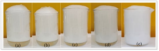 Gel–foams with different mass fractions of foam stabilizers ((a)—0.1%; (b)—0.3%; (c)—0.5%; (d)—0.7%; (e)—0.9%).