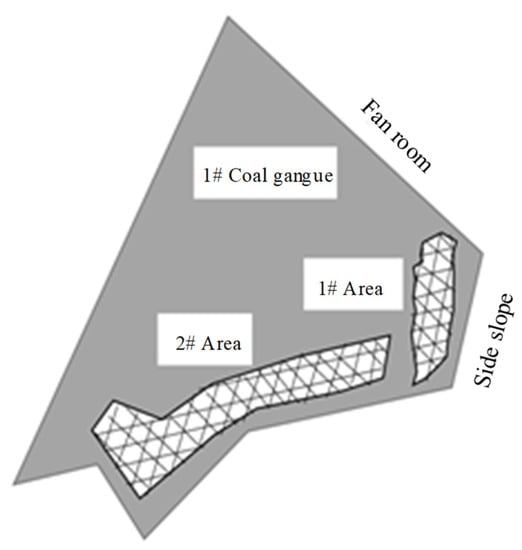 A coal gangue in Yu County, Yangquan, Shanxi, as shown in Figure 8, of 1 # coal gangue mountain preliminary determination, 1 # surface anomaly area, and 2 # surface anomaly area, as shown in Figure 9, was selected within the length of 35 m, width of 5 m and the length of 55 m, with a width of a 5 m long area for grid division. The arrangement of a high-temperature regional surface temperature and harmful gas detailed measurement points is seen below, with the same direction of each adjacent measurement point spacing for 5 m.