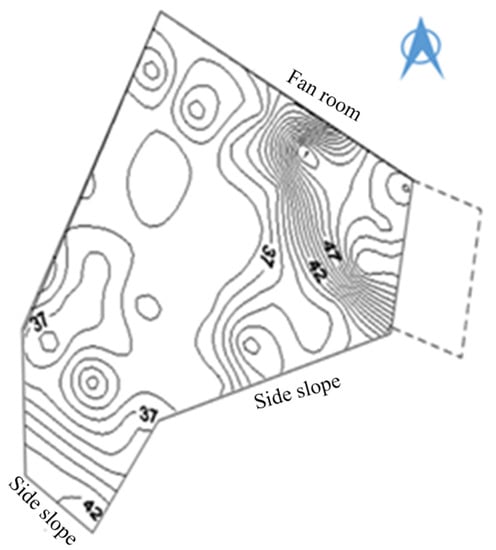 In the coal gangue mountain platform, a vehicle-mounted drilling rig is used for drilling, with a detection drilling depth according to the actual situation at the site. Generally, it is appropriate to see the gangue after continuing to drill 2 m, with a drilling diameter of 75 mm, and any two adjacent drill hole distances between 10 m: the specific layout is shown in Figure 10. There is an area using armored temperature sensors to measure and monitor the temperature of the bottom of the borehole, to record the temperature of each measurement point (°C), as seen in Figure 11, a coal gangue mountain surface temperature isogram.