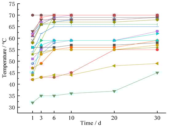 (4) Temperature resistance experiment. Using an electric blast drying oven as a heating source, we set the heating temperature to 200 °C unchanged. The temperature resistance time of different gel–foam ratios was investigated according to the half-life.
