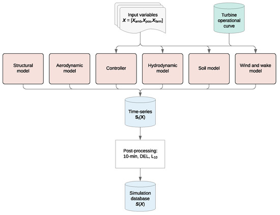 Process of aero-servo-hydro-elastic simulations using sampled input variables. The figure is taken from [15] which is distributed under CC BY 4.0 License. Details of the license are available at https://creativecommons.org/licenses/by/4.0/ (8 July 2021).