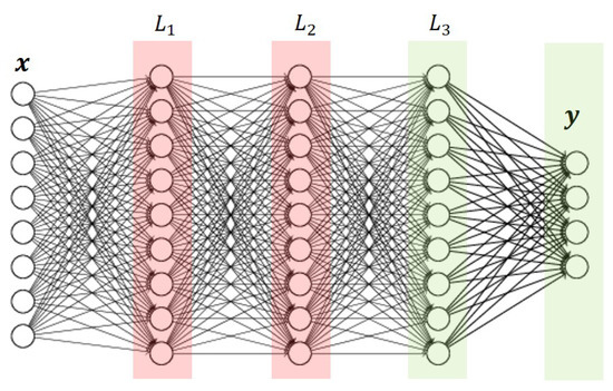 The first method used for training a normal behavior regression model is an artificial neural network (ANN). The ANN is selected due to its high potential for delivering fast and accurate predictions for a variety of applications, such as demonstrated in previous studies [5,20,21]. As illustrated in Figure 3, an ANN consists of a number of neurons which are organized in layers L. Its simplest form is a multilayer perceptron (MLP), in which the input vector is processed forward through the hidden layers to calculate and output vector . Figure 3 shows a network with three hidden layers and input and output vectors as used in this study.