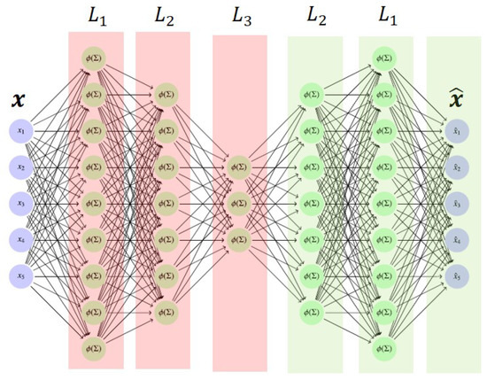 Secondly, an autoencoder (AE) is used as an alternative method for building a normal behavior model of the power. Previous studies have highlighted the promising use of denoising autoencoders for fault detection purposes with its advantages of strong learning abilities together with the decreased risk of overfitting [22,23]. A basic AE is a feed-forward neural network with one hidden layer, also called code layer, and the output vector being equal to the input vector. An AE is composed of an encoder function , which maps the input vector to the code, and a decoder function , mapping the code back to a reconstruction of the input . When multiple AE layers are stacked to form a deep learning network it is called a stacked auto encoder (SAE). Figure 4 shows an example of such a stacked autoencoder with the code layer and the remaining hidden layers and . By setting the size of the code layer to be smaller than the input dimension, the network is forced to model a compressed, lower-dimensional latent subspace Z. To make sure that the network does not simply reproduce the input signal, Gaussian noise is added to the input. This modified version of the AE is called a stacked denoising autoencoder (SDAE). Several studies used AEs as a regression model for WT monitoring [22,23].