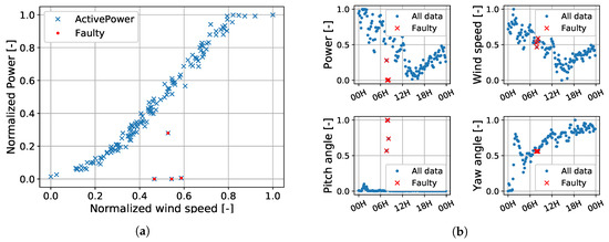 The detection ability of the normal behavior models was tested on one month of raw SCADA data (1 May to 31 May 2016). During this period, the SCADA system recorded an implausible blade angle on 21 May 2016 for a duration of 31 min. Figure 6 shows the power curve and time-series measurements of power, wind speed, pitch angle and rotor speed for the time window in which the alarm occurred. The signals are normalized by their maximum value.