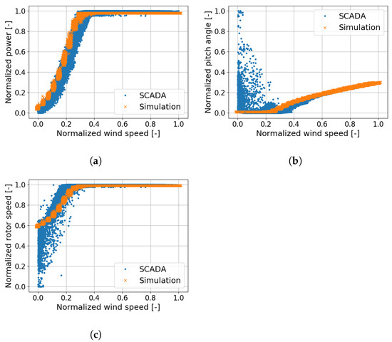 Comparison of measured and simulated data used for building a normal behavior model including (a) power, (b) pitch angle and (c) rotor speed with respect to the wind speed.