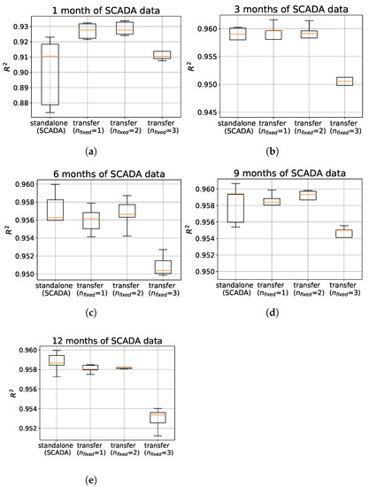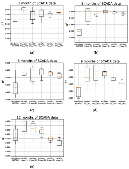 ANN target model performance on different amounts of normal SCADA data and knowledge transfers. Each boxplot represents the distribution of the models trained within the five-fold crossvalidation. The target models are trained using 1 month (a), 3 months (b), 6 months (c), 9 months (d), and 12 months (e) of normal SCADA data.