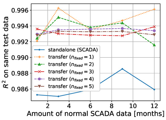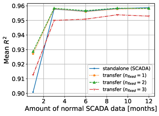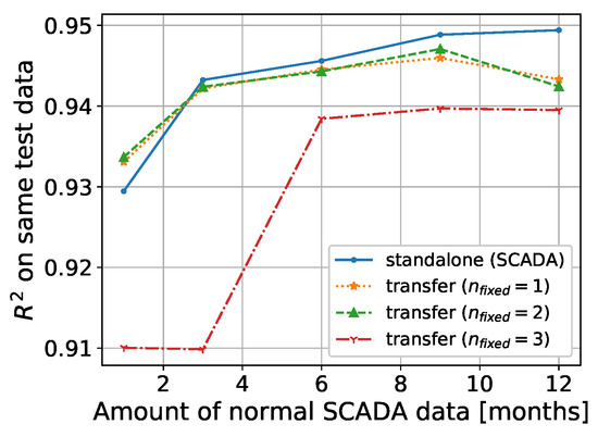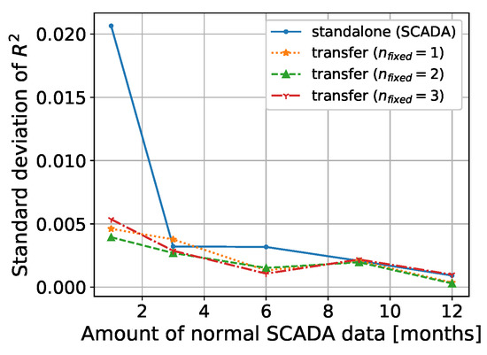 The results show that the sample efficiency of a SCADA-based ANN can be significantly improved by pretraining it on a large aeroelastic simulation database. In the case when only one month of measurement data are available, the model prediction error is reduced by a NRMSE reduction of 1.64% (see Figure 11). Furthermore, the decreased standard deviation of the model accuracy for repeated model calibrations from to (see Figure 12) shows that the predictions become more robust when the suggested transfer learning method is applied. However, both in terms of the model accuracy as well as its robustness, it can be seen that the more SCADA data available for building a monitoring model, the less improvement can be achieved. The optimal learning transfer of the ANN with three hidden layers is to keep the first two layers from the source model fixed. Keeping all hidden layers fixed and only retraining the output layer on the SCADA data, on the other hand, results in a negative learning transfer, i.e., a decreased model performance compared to the standalone SCADA-based ANN. In this case the physics constraints seem to be to large for improving the target learning task of the normal power estimation. The prediction accuracy of the models compared on the same 3 months test period in Figure 10 shows slightly different results since only one fixed training period is used as compared the crossvalidation method mentioned above. However, the results confirm as well an increased accuracy when keeping up to two layers fixed and decreased performance when all hidden layers are fixed.