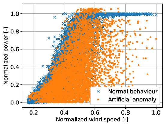 The hyperparameter tuning of the autoencoder requires more effort compared to the previous ANN since we need to make sure that autoencoder also works on detecting anomalies and does not simply reconstruct power by using the power solely. Therefore, its ability to detect anomalies on a validation data set with artificially introduced anomalies was also considered during the tuning process. An artificial validation data set was constructed based on 3 months of normal filtered SCADA data , by including 43% of abnormal observations , of which 10% represent an abnormal increase in power between 100 and 300 kW, and the remaining 90% represent a 300–500 kW increase in power (see Figure 14). These power differences were created by randomly sampling from an uniform distribution.