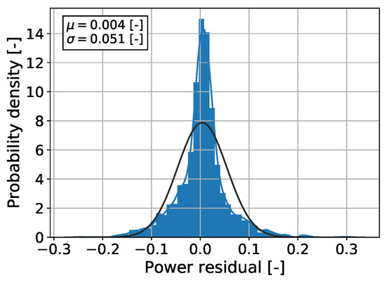Probability density function of testing residuals including normal distribution fit for standalone SCADA model.