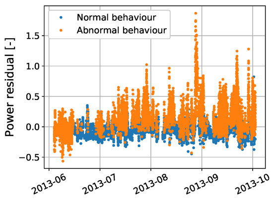 After training and evaluating the normal behavior models, they are applied to the raw SCADA data to estimate the power output. As presented in Figure 5, the power estimation is compared with the actual measured power y by calculating the residual :