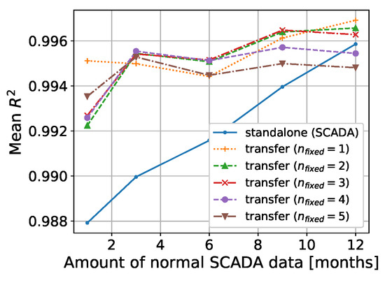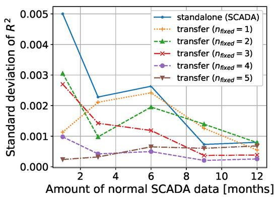 For the transfer learning, the last one and up to five layers of the source model were retrained on the SCADA data using 100 epochs. The prediction accuracy of the autoencoder on the test set is presented in Figure 19 with each boxplot presenting the distribution of values of each five-fold crossvalidation. Furthermore, the average accuracy metrics of the models are shown in Table 2. Figure 20 and Figure 21 illustrate the mean and standard deviation of the models for different amounts of SCADA data with respect to the amount of SCADA data used for the training. Similar as for the ANN, Figure 22 shows the model performances using the same 3 months test data.