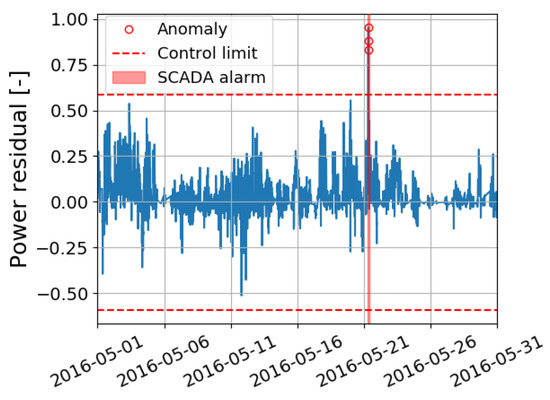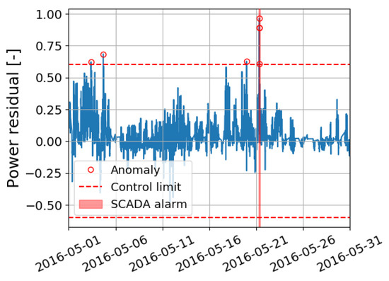 with the average prediction error , the standard deviation of prediction errors , and the number of observations n used for testing. The constant is manually tuned in order to attain the confidence interval that avoids sensitivity toward data variations. A residual of the predictions on new SCADA observations that surpasses the control limits is assumed to have low probability based on the trained normal behavior model and is therefore detected as an abnormal observation.