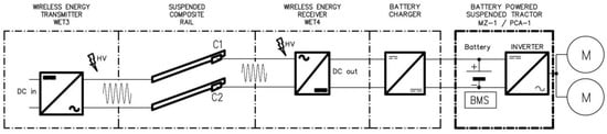 The schemes shown in Figure 1 and Figure 2 are part of a larger system being developed within the HEET II project. The concept of this system is presented in Figure 3. The solution is designed to transmit energy wirelessly, particularly to receivers on the move. This will extend the battery runtime of devices moving along the suspended route. Hence, a suspended tractor (BATTERY POWERED SUSPENDED TRACTOR) was selected as an example machine with a WET receiver. To achieve the capacitive coupling, it is necessary to change the construction of the suspension route rails (RAIL), which will be made of a composite material. A pair of capacitor plates will be incorporated into the structure. The second pair of plates will move with the tractor, forming the capacitive coupling. The capacitive coupling cooperates with the power electronics modules, as well as the high-frequency and high-voltage energy transmitter (WET3) and receiver (rectifier, WET4). In the proposed solution, the WET3 module is powered by a single-wire energy transfer system (Figure 2). More details related to the development of the WET power system are presented in [].