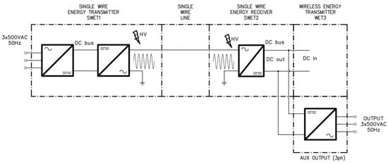 The transmitter of the WET system in the proposed solution is supplied with DC current. The current is supplied through a single-wire energy transfer (SWET) system, the scheme of which is shown in Figure 2. In this system, the high-voltage and high-frequency output current is transmitted from the transmitter to the receiver through a single wire. The electrical circuit is closed using either a ground or a return conductor. Systems of this type are known in the literature [,,], and are readily used in sparsely urbanized areas []; however, they have not been used in underground mining. In the planned system, the SWET also provides a three-phase output, compatible with the parameters of the mains supply. Selected issues related to the efficiency of the developed system are presented in [].