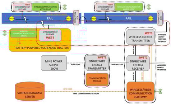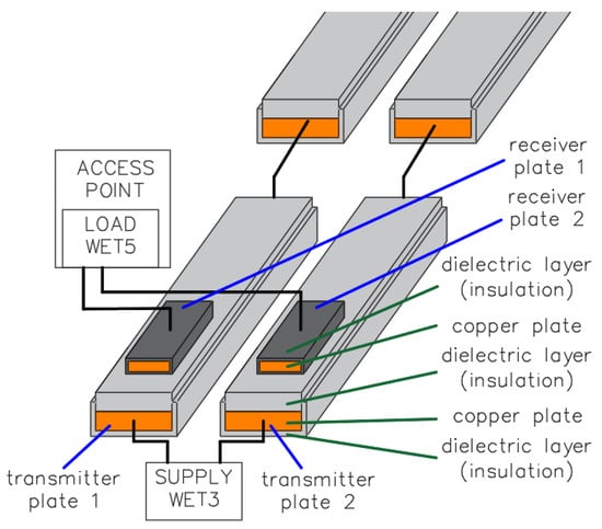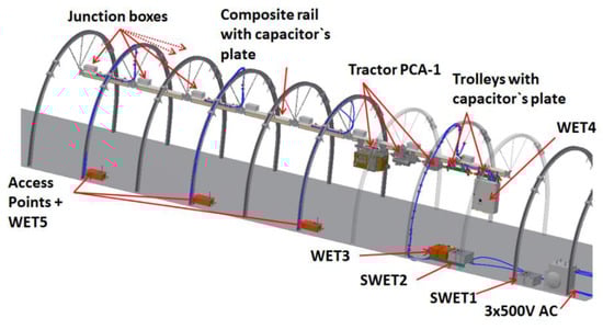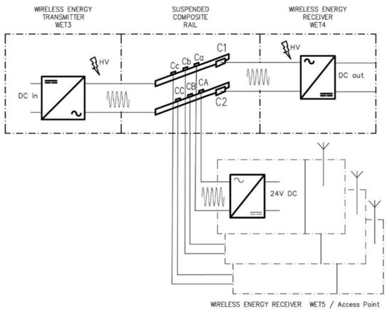 As can be seen in Figure 3, an important part of the overall system is the subsystem related to communication and monitoring of environmental parameters along the suspended route. The communication subsystem uses wireless transmission between the suspended tractor, the energy transmitter module of the WET system (WET3), and the sensor and communication modules (access points) associated with the suspended route. To eliminate the need to run power cables to these sensor and access point modules, they were also equipped with the WET wireless power system. The latter is a low-power system; the capacitive coupling is achieved using a pair of fixed plates placed on the suspended track, together with a pair of plates placed on the suspended track. In this case, the capacitor plates placed on the composite rail form a common power bus, both for the receiver in the suspended tractor and for the receivers in the access point modules. The system shown in Figure 1 is extended with additional power components, as shown in Figure 4.