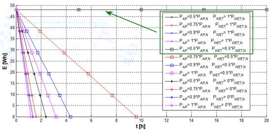 Results of a simplified simulation of a change in the remaining energy in the battery during operation, depending on the access point’s load and the extracted power from the WET system (PWET,N = 50 W, PAP,N = 40 W).