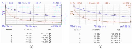 Equivalent capacitance CS (a) and resistance RS (b) for the distance of 7 mm (dielectric layer) as a function of the frequency [].