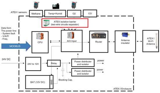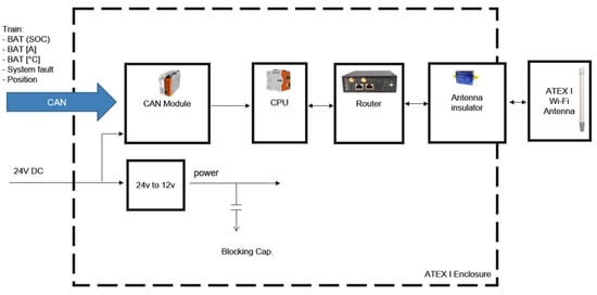 A block diagram of the suspended tractor monitoring module is shown in Figure 10. Similarly to the access points, everything is enclosed in an ATEX-certified enclosure with an ATEX-certified Wi-Fi antenna.