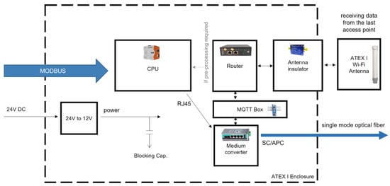 The gateway acts as the main connection to the surface database server; it wirelessly receives the data from the suspended tractor monitoring module and the access points; additionally, it is connected to the single-wire energy receiver SWET2 and the wireless energy transmitter WET3 using the Modbus protocol, and forwards their data. It is connected to the surface database server via a single-mode optical fiber. A block diagram of the gateway is shown in Figure 11. Similarly to the access points, everything is enclosed in an ATEX-certified enclosure with an ATEX-certified Wi-Fi antenna
