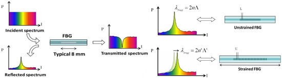(a) Light spectrum: incident, transmitted, and reflected; (b) Bragg shift concept [21].