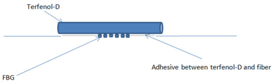In order for light to be reflected (bounced back, away from the new medium), the angle of incidence must equal the angle of refraction, i.e., θ1 = θ2. The reflection of light at the interface between two different media is commonly known as Fresnel’s reflection effect. According to [18], the refracted angle tends to get smaller than the incident angle, when light is travelling from a fast medium to a slow one (for example, from air to water); whereas, for the converse light movement (water to air), the incident angle tends to get larger, but it cannot exceed 90° while remaining in the new medium. Hence, this incident angle constraint suggests that the largest incident angle for refraction occurs when n2 < n1. However, beyond a certain incident angle, known as the critical angle, θc, there will be no refraction at all, and the light wave will be totally reflected away from the new medium through which the light had been intended to travel, provided n2 < n1 still exists. This is called total internal reflection, and this is the principle utilized by optical fibers [18]. In a typical optical fiber silica cable, the core with a higher refractive index, n1, is surrounded by a cladding whose refractive index, n2, is only about 1% lower than that of the core, in order to satisfy the condition for total internal reflection [18]. For example, the core could have n1 ≈ 1.4475 and the cladding n2 = 1.444, and provided the fiber cable is not excessively bent, the light will just bounce around in the cable, with minimal loss [18]. To obtain a Gaussian spectrum with a center wavelength for the grating, a high-powered laser is used to uniformly vary the refractive index of the core using a phase mask, on which the specific pattern is imprinted. As the light travels through the core, it comes into contact with the gratings, which in turn reflect the light, producing a transmitted spectrum and a reflected spectrum, as shown in Figure 1. The reflected spectrum is eventually used as the FBG sensor reference spectrum, with its center wavelength pre-determined during the phase mask fabrication process. By imposing an external force or disturbance on the FBG, a wavelength shift, proportional to the perturbation applied, is observed [19], as shown in Figure 1. This wavelength shift is called the Bragg shift, and this is the fundamental principle of FBG sensing. Measurands that act as perturbations in FBG sensing include temperature, vibration, pressure, and displacement. However, if FBG are to be used for sensing a magnetic field, they will require a transducer to convert the magnetic flux into one of the aforementioned measurands, in order to be able to cause Bragg shifts. This is mainly because optical fibers are inherently immune to electromagnetic fields; hence the use of terfenol-D in this research, as shown in Figure 2. Prior to carrying out experiments, the effect of the number of bonding points on the metal surface-mounted FBG sensors was investigated and reported in [20], which took account of the impact of the adhesive used.