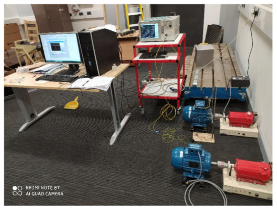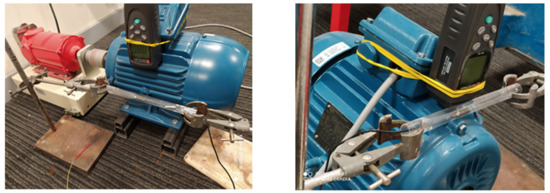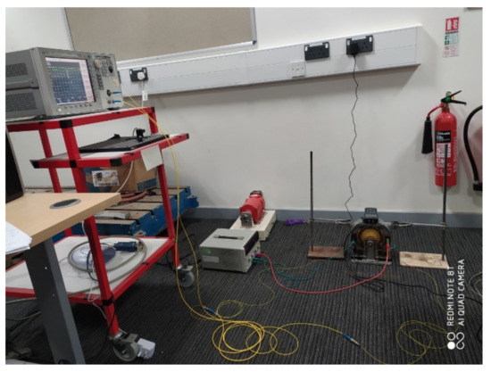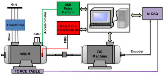 A typical experimental test rig for FBG sensing is shown in Figure 3, whilst the set up used for this work is shown in Figure 4. The FBG-T test rig was set up for both healthy and broken rotors. Each of the motors was used to drive a DC motor as the load, with the FBG-T transversely positioned at the drive end of the induction motor, using the rotor shaft center as a reference. Stray magnetic flux was also measured using an auto datalogging flux meter (HHG1394) manufactured by Omega Engineering UK, in order to acquire numerical data of the flux. The HHG1394 comes with proprietary software and a tri-axial sensing functionality, which makes if suitable for low- and extremely-low-frequency magnetic fields, independent of the measurement angle. The sensor was then connected to the bi-functional broadband light source and optical spectrum analyzer (OSA), which were serially connected to a PC via a National Instrument GPIB cable. This was to allow the use of LabView software (manufactured by National Instruments, TX, USA) to collect and store the numerical spectral data, which could then be retrieved and analyzed in MATLAB. The motor was driven by a variable frequency drive (VFD).