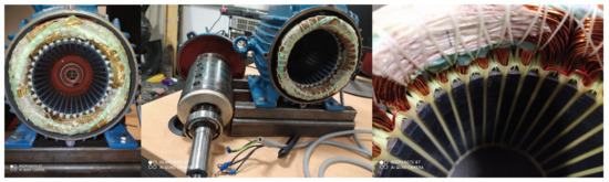 Each machine was run at a similar frequency range, between 5 and 30 Hz, with 5 Hz intervals, for more than four hours, after which the motor was then turned off. Prior to running the healthy motor, it was disassembled and observed, to confirm its healthy state, before reassembly. For the broken rotor and short circuit inter-turn conditions, holes were bored to emulate the former, while copper windings were used to bridge turns within the motor to emulate the latter condition, as shown in Figure 5.