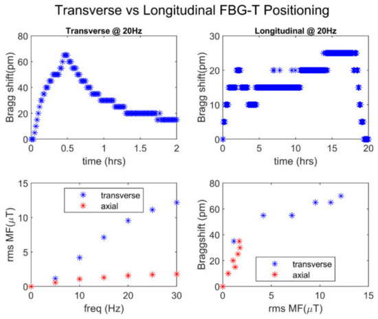 Longitudinal (left) and transverse (right)-locating optimal positioning of FBG-T sensor for stray magnetic flux monitoring.