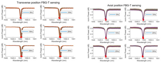 Given the results of the analyses from both sensor positions, it was apparent that the transverse position offers more consistency in sensor behavior, which is in line with the expectations in the presence and lack of a magnetic field (Figure 7). The axial positioning of the FBG-T was erratic, and given the already inherent hysteresis property of the terfenol-d alloy, the introduction of additional unpredictability would put in doubt the realization of a reliable condition monitoring sensor for machines. It is noteworthy that the transverse sensor positioning needs some resetting each time the sensor is to be re-used, as it may or may not return to the exact initial wavelength. The variation of observable stray flux with frequency for both transverse and axial sensor positions showed that more flux will cut across the sensor when placed in the transverse position at the drive end of the machine compared to the axial position (Figure 7). Although this was attributed to the reduced surface area of the flux-attenuating and corrugated yoke, one could argue that the transverse position is closer to the source of the magnetic flux, which is in the air gap within the machine; since the air gap is between the rotor and the stator, whose windings are wrapped internally close to the flanges of the machine. Given that the stray flux is already mitigated, a reasonable amount is required to cause magnetostriction in the FBG-T sensor. Based on only the optical spectral response (Figure 8), there was no observable difference in terms of sensor position; instead there was evidence that the FBG-T sensor was, indeed, sensing the stray magnetic flux present. From both a behavioral characteristic and observable magnetic flux density viewpoint, the transverse position became the experimental choice and, thus, was utilized throughout the rest of the investigation.