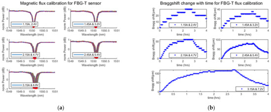 To calibrate the FBG-T sensor, a magnetic field source and a magnetic field sensor were needed. In order to create different magnetic field strengths, a DC power supply unit was used to inject different amounts of current, to excite the windings of an openly-wound 4V DC motor. A tri-axial auto data logger magnetic flux meter was used to measure and record the stray magnetic flux density for each current applied. The complete setup was as shown in Figure 9, where different amounts of current were applied to generate magnetic fields of different strength, measured by the auto-data-logging flux meter. Plots showing the optical spectra and time variation of the Bragg shift for each test current and corresponding magnetic flux density in Figure 10a−c show the directly proportional relationship between the current and the magnetic flux and, as a result, the Bragg shift observed. The optical spectra visibly indicated the increase in the Bragg shift with current, given that the magnetic flux in this case was DC in nature. The unipolar nature of terfenol-D magnetostriction was evident in the time-varying plots of Bragg shift, where there was a steady increase in the Bragg shift with time, until the maximum Bragg shift was attained. The rate at which the Bragg shift occurred for each current value appeared to be faster than the rate observed for earlier tests performed with stray flux, which is sinusoidal in nature. Figure 10d confirms the sensitivity of the FBG-T sensor, which was 19.3810 pm/μT. Temperature was measured to confirm the minimal change in ambience, with a maximum change of about 0.13 °C.