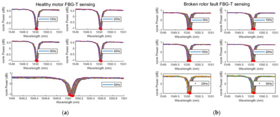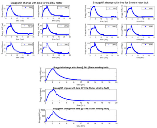 Based on the spectral response alone, only the short circuit inter-turn fault condition showed obvious and excessive Bragg shifts, as shown in Figure 11. The healthy and broken rotor conditions showed Bragg shifts, but it was not possible to precisely distinguish between the two conditions, hence a further analysis of the numerical results obtained was necessary.