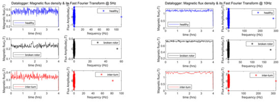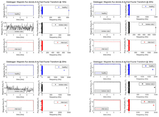 During magnetic flux calibration, it was observed that the FBG-T response to DC magnetic field was straightforward, in that it did not exhibit any further Bragg shift once the field was removed, and it returned to its initial wavelength within minutes. This difference in sensor response was clearly due to the nature of the magnetic flux in this case (AC or DC); therefore, it was justifiable to consider analyzing the frequency content of the AC stray flux, as this was the remaining factor yet to be analyzed, and which could confirm the significant difference in response for the inter-turn fault compared to the broken rotor and healthy conditions. Figure 13 shows the spectral content of the stray magnetic flux at each motor frequency, under healthy, broken rotor, and short circuit conditions.