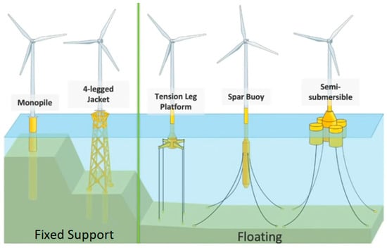 The main difference between onshore and offshore wind turbines is how offshore wind turbines are structurally supported. There are broadly two types of offshore wind turbines, i.e., fixed-support and floating. As their names suggest, a fixed-support offshore wind turbine has foundations fixed to the seabed, while floating offshore wind turbines have floating support structures, which are connected to the seabed through mooring cables. Further classification of offshore wind turbines is shown in Figure 2. It can be seen that there are two types of fixed-support offshore turbines in operation commercially, i.e., monopile and jacket. A monopile support consists of a single tower-like structure embedded into the seabed through suction and gravity, whereas jacket support structure comprises of three or four-legged lattice configurations. The primary constraint that fixed-support offshore wind turbines face is that they can be installed in a maximum seabed depth of 60 m. In deep waters (>60 m depth), fixed-support structures become commercially inviable, i.e., cost of installation increases considerably. Most of the commercially installed and operational offshore wind turbines in the world (currently) have fixed-support structures [2]. However, there are some significant issues with this technology. The foremost issue is that more than 80% of offshore wind energy is available off-coast, i.e., far away from land and in deep waters (seabed depth of >60 m). Another limiting factor of fixed-support wind turbines is their size; the biggest rotor diameter currently installed is 80 m, with the turbine having rated power of 1.8 MW. The visual impact of these type of offshore wind turbines is another factor to be considered seriously.