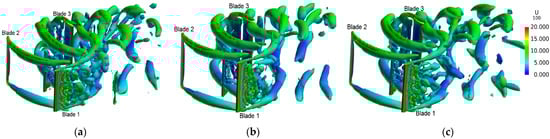 Coherent structures around an offshore vertical-axis wind turbine at (a) mean surge position, (b) maximum surge displacement and (c) no surge motion (Adapted with permission from ref. [16]. Copyright 2017 Energy).