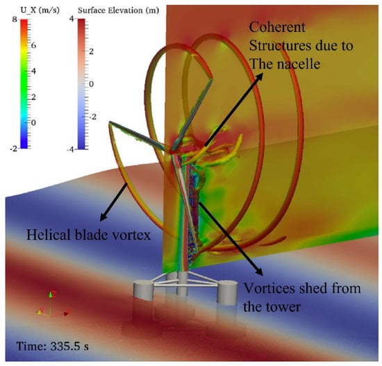 In these models, A and θ denote amplitude and phase of the wave, respectively. Moreover, θ = kx − ωt with k and ω being the wave number and circular wave frequency, respectively. Additionally, H = 2A stands for the wave height and d is the depth of water. An important concern in computational modeling of these problems involves handling the reflection of waves from the outlet boundary. This was achieved by introducing a sponge layer near the outlet boundary by adding a source term in the Navier–Stokes equation for momentum balance. This source term contains an artificial viscosity term as a damper in the virtual environment. Figure 6 depicts the coherent flow structures formed due to rotating blades, tower, and the nacelle of the turbine. However, how these vortices influence aerodynamic forces and moments, and contribute to stabilize the floating structure, are still unknown. The extraction of these complex flow features and uncovering their relations to instantaneous performance metrics are crucial to the design of high-performance FOWTs. A similar turbine and floater model has been employed by Tran and Kim [26] for the numerical analysis using the overset grid method and a quasi-static model for loads on mooring cables. Furthermore, Lienard et al. [50] reported that out of all the DOFs, pitch and surge motions of foundations have more influence on the performance of wind turbines.