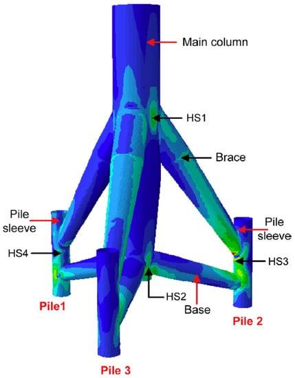 Severe fatigue locations on a tripod foundation (Adapted with permission from ref. [87]. Copyright 2018 Applied Ocean Research).