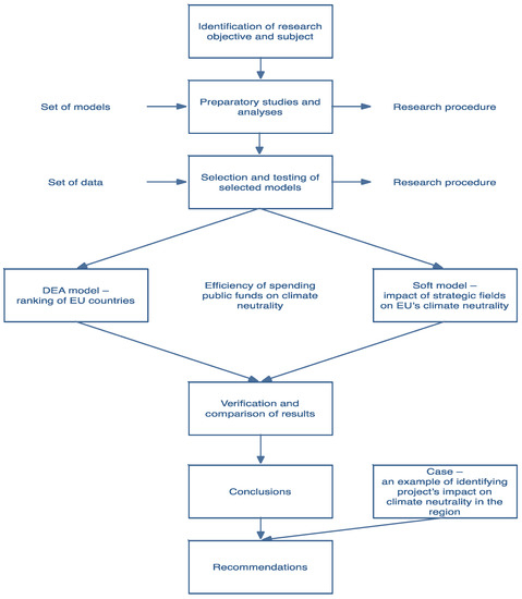 The way the research was designed is presented in the flow chart in Figure 1. On the basis of literature analysis, the research objective and subject were identified. Among the economic and statistical methods, two were selected, which according to the authors gave the best possible results. Next, the theoretical specification of DEA and soft modeling models was elaborated. The next step was to conduct the statistical analysis of the available quantitative data. On the basis of the analyzed data, particular models were tested. As a result of implementing the DEA model, a ranking of European Union countries was developed regarding the efficiency of spending public funds on environmental protection for the effects obtained in the field of climate neutrality objectives. The soft model served to investigate the impact of particular strategic fields on the EU climate neutrality objectives. In the next step, there was a verification and comparison of results. In order to examine the reasons for the detected dependencies and come to more profound conclusions, a case was analyzed, i.e., the impact of particular projects implemented in one Polish region on climate neutrality objectives. The implemented methods served to draw conclusions and define recommendations.